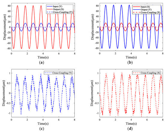First, a 1 Hz sinusoidal command signal with peak-to-peak amplitude of 30 μm was applied to the PEA to test the amplification ratios and cross-coupling errors. The experimental results, including the output displacements and cross-coupling errors were measured by the laser sensor in both directions, which are shown in Figure 18. The maximum displacements in the X-axis and Y-axis of the stage were 80.89 μm and 82.70 μm, respectively, which indicates that the amplification ratios of the stage in the X-axis and Y-axis were 5.39 and 5.51, respectively. Thus, the experimental amplification ratios in the X-axis and Y-axis were 19.1% and 16.5% smaller than the FEA results, respectively. These errors were mainly due to the fact that the tip of the PEA was a ball head and, hence, the contact area between the spherical surface and the plane made the real contact surface in the experiment smaller than the size set in the finite element simulation, thus leading to a deviation. In addition, Figure 18 also shows the cross-coupling errors in the Y-axis (X-axis) when the stage moved along the X-axis (Y-axis). As depicted in Figure 18, the maximum cross-coupling errors in the Y-axis and X-axis were approximately 1.1 μm and 1.2 μm, respectively. Hence, the experimental cross-coupling errors in the Y-axis and X-axis were 1.36% and 1.45%, respectively. The difference in performance between the two axes may be mainly attributed to: (1) The asymmetry of the stage due to manufacturing errors, (2) the different pre-loading conditions of the PEAs, and (3) the influence of the contact area on one side of the input.