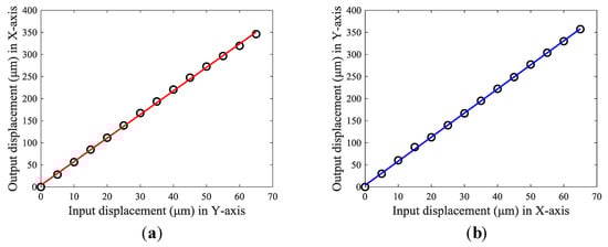 Experimental testing results of the stroke in (a) output displacement in the X-axis and (b) output displacement in the Y-axis.