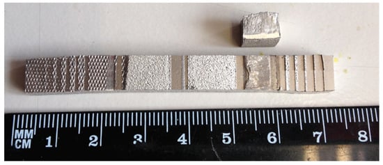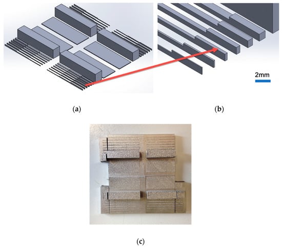 A series of generic patterns was designed to test the pattern printing precision and bonding strength with the substrate, as shown in Figure 1a. These rectangular ridges had the widths of 0.1, 0.2, 0.4, 0.6, 0.8, 1 mm and the height 1, 0.6 and 0.3 mm, as shown in Figure 1b. The substrate (17-4PH stainless steel) (Special Steels Ltd., Dublin, Ireland) was pre-machined by die sinking electrical discharge machining (EDM) (Agie Charmilles, Losone, Switzerland) and was pre-located in the powder platform before printing.