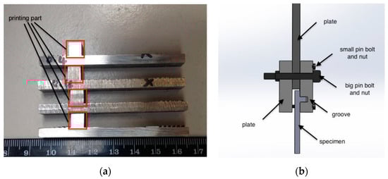 The scratch tests and lap shear tests were used to evaluate the bonding of the printed patterns. In the preparatory test, a Rockwell indenter was used and scratching was repeated three times across the substrate and printed stainless steel 316L using a nominal load of 5.2 N. Additionally, the printed large ridges in Figure 1c (6 × 7 mm) on each of the four different roughness surfaces were cut into identical samples. The samples with a roughness of 2.5 µm and 0.4 µm were used to carry out shear testing using a standard tensile tester. Figure 3 shows the test samples with one printed block on the substrate. Each sample was gripped by a specially designed holder (Figure 3b) for tensile testing, with shear force being applied to the printed ridge and bond strength being assessed directly.