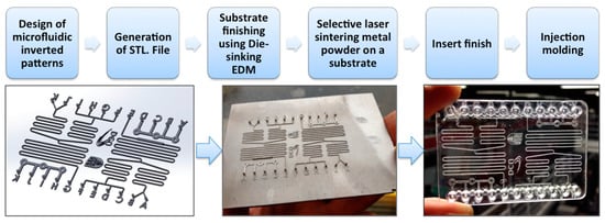 The present work developed a new process by directly printing metal micro patterns onto a finished substrate to manufacture a mould tool for the prototyping and manufacturing of polymeric microfluidic devices, as shown in Figure 4. The inverted microfluidic pattern was designed using 3D CAD software (Autodesk, Inc., San Rafael, CA, USA), and this was converted to stereolithographic (STL) format for a laser selective melting machine; the substrate onto which the pattern was printed and was finished using Die-sinking electrical discharge machining or another finishing method. Subsequently, the pattern was directly printed onto the substrate and the substrate was finished as a tool insert to be incorporated into an injection moulding mould. The chip was then fabricated using injection moulding and, finally, the chip was closed with a thermally bonded cover.
