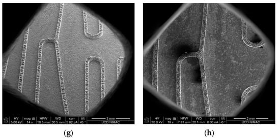 Figure 6 shows the microfluidic features printed on the substrate based on the microfluidic design shown in Figure 2 and Figure 4. The inverted channel width is ~230 µm and height is ~380 µm. Similarly, the top of the inverted channels is not flat, and both sidewalls also show balls and partially melted particles. The ball formation during laser melting at the top of the micro channel makes the channel rougher than the sidewalls, where the ball size is from ~70–100 µm, based on scanning electron microscope (SEM) measurement.