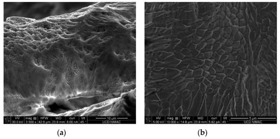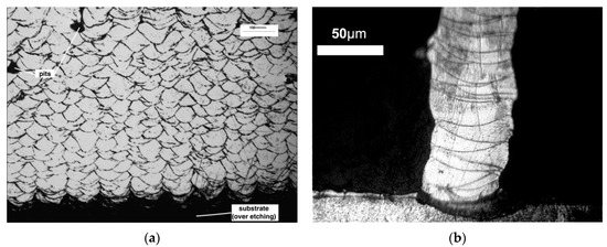 Since the fracture failure happens only within stainless steel 316L, the hardness and microstructure of the features themselves are important to determine the performance of the tools. Figure 13a shows the microstructure of SLM printed stainless steel of 6 mm width for the shearing test. The grain size is approximately 50 µm. These grains are arranged in a fish-scale segregation pattern with a clear indication of the scan layer path from the bottom to the top, which is also the heat transfer direction during laser scanning and solidification, similar to what was found from [26]. Additionally, the voids on the cross-section are also present, due to possible entrapped gas that is insoluble in molten pools of stainless steel 316L, and a possible excessive energy input and unstable process [27]. Figure 13b shows the smallest feature that has a 100 µm nominal width. It can be seen that the single grain layers stack together to form an individual feature. This means that the laser spot size limits the feature size that can ultimately be achieved. Promoting diffusion is important to enhance the mechanical strength of micro features. The hardness of printed stainless-steel micro patterns was measured to be 250HV0.2.