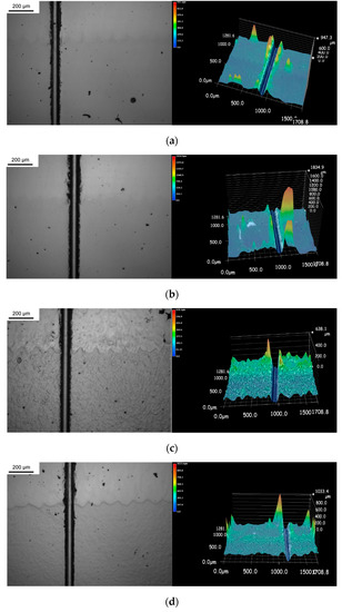 2D top view and 3D view of the scratch across the cross-section of printed metals and substrate: (a) Ra 0.4 µm, (b) Ra 0.8 µm, (c) Ra 1.4 µm and (d) Ra 2.5 µm.