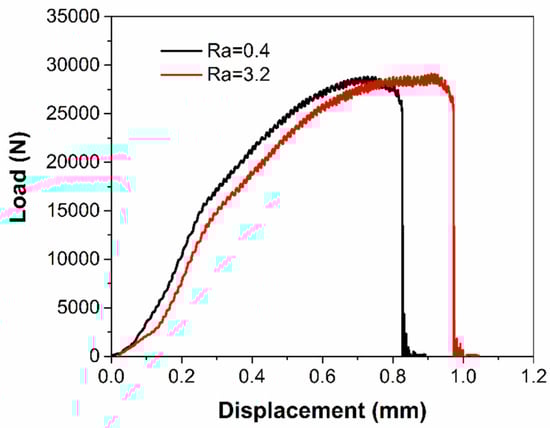 Figure 10 displays the load versus displacement (time) at shear testing. The tensile shear strength is obtained directly from the peak load. According to Equation (1), the average tensile shear strength for the Ra = 0.4 µm substrate is 573.4 MPa, while it is 599.8 MPa for the Ra = 2.5 µm substrate. The Ra = 2.5 µm sample has a 4.6% improvement in the shear stress compared to the Ra = 0.4 µm sample. The shear strength is obviously much larger than the design shear stress of 68 MPa. It is also seen in Figure 11 how the fracture surface shows that the crack occurs purely within the printed ridge rather than at the bonding interface. This confirms the sufficient mechanical strength between SLM printed patterns and the substrate. In other words, 3D printing via SLM can provide a strong tool for mould tool applications. As a printed structure, the pores formed by entrapped air may influence the mechanical strength. Figure 12 displays the cross-section of micro features, showing internal pores. Some discontinuous regions of metal are also observed, because of insufficient melting and a lack of diffusion of metal powders. This indicates that the process needs to be optimized. Subsequent heat treatment could be also an effective way to form denser features.