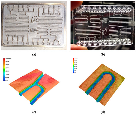 Injection moulding was used to produce microfluidic chips using SLM printed tools, as shown in Figure 14. The chips were then subsequently bonded by thermal diffusion bonding. However, it has to be mentioned that the current printed mould has a rough surface leading to demoulding difficulties. A mould release agent was used to help demoulding of the injection moulded part. Several hundred plastic chips were fabricated without any problem presented from the tool. In Figure 14c,d, the 3D images measured using Keyence VHX-5000 digital microscope (Keyence, Milton Keynes, UK) shows the morphology of the bottom channels of microfluidic chip, where the average roughness is ~96 µm. This value is obviously larger than reported in the literature where average roughness can be as low as ~7 µm [28]. Due to accessibility of the SLM system, the authors could not optimize the printing process. Future work will be carried out with the SLM process optimization and hybrid SLM and the machining process, as discussed in Section 3.7. The injection moulding process can be further optimized based on new mould insert.