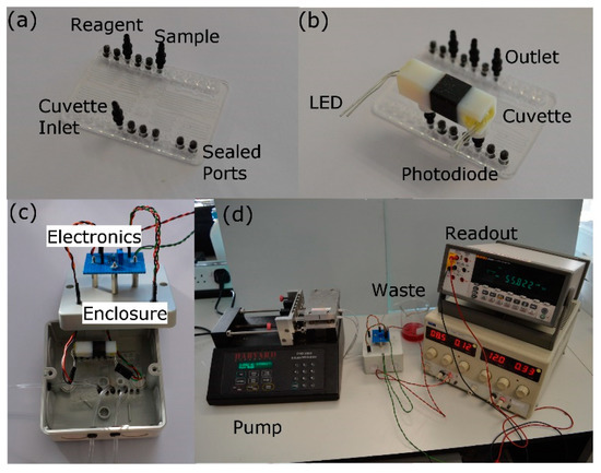 The experimental procedure from chip to system for testing of plastic chip manufactured using the injection moulding process based selective laser melting fabricated tools: (a) microfluidic chip with connectors and (b) cuvette, and (c,d) entire enclosure and testing system.