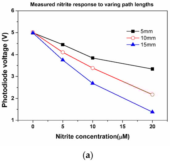In order to test the range and sensitivity capabilities of the chip, the tests were carried out using three different cuvette path lengths of 5, 10 and 15 mm. For each cuvette length, a drop in the photodiode signal was observed for the increasing Nitrate concentration, as seen in Figure 16. Furthermore, the reduction in measured photodiode signal indicated by photodiode voltage with increasing Nitrite concentration, was more pronounced with the increasing cuvette path length. These findings are entirely consistent with existing literature [29] and demonstrate the utility of the manufacturing process in developing a test platform for nutrient detection.