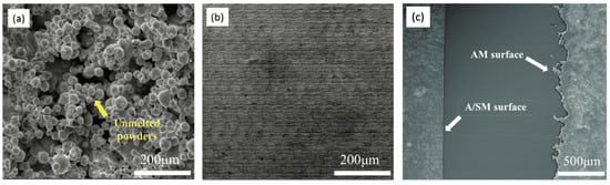Surface morphology of as-printed parts (a), from hybrid SLM and machining process (b) and (c) [25].