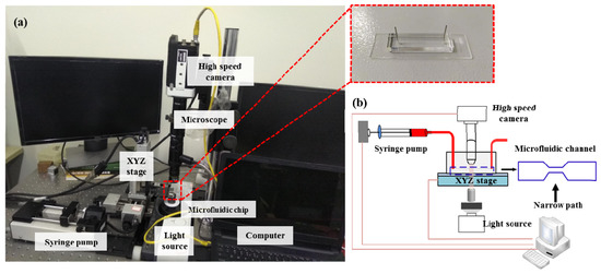 (a) The overview of the experimental system device (inset shows polydimethylsiloxane (PDMS) microfluidic chip), (b) its detailed work schematic diagram and microfluidic channel geometry.