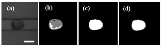 (a) The region of interest of video was determined and the image smoothed with Gaussian filtering. (b) Background subtraction. (c) The hole in the contour was filled. (d) The image was filtered and the contour was processed by convex hull. Scale bar: 20 μm.