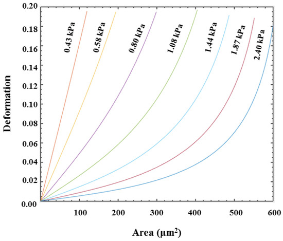 In the microfluidic channel, cell deformation depends not only on its elastic modulus, but also on its size, the channel size, and flow rate [30]. Reports [34,35] try to give the relationship between cell size, deformation and cell’s elastic modulus by taking advantage of an analytical expansion of the Stokes equation [34]. For different flow rates and channels, the coupling relationship between size, deformation, and stiffness is just proportional to scale. The equation can be described as