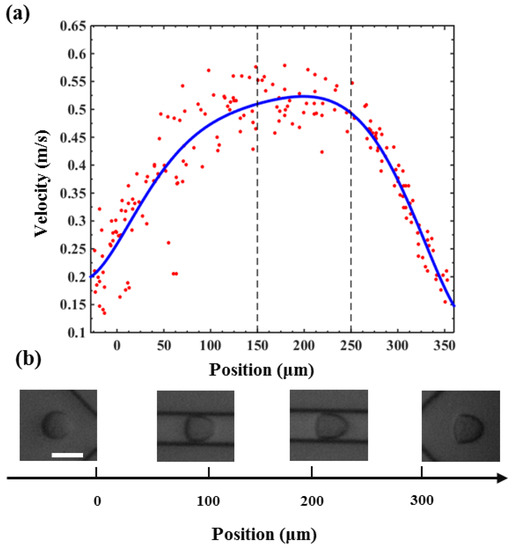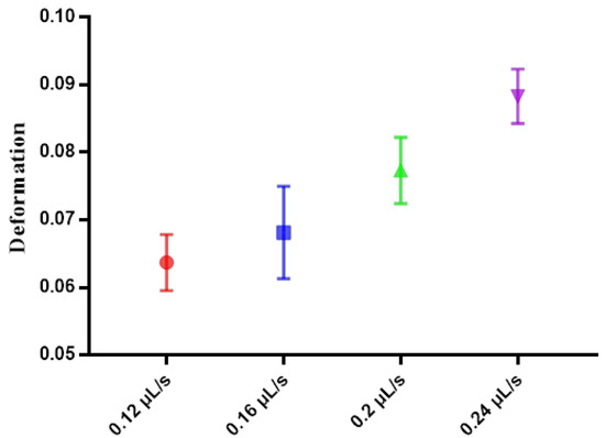 In this section, the velocity distribution of PC3 cell in the 300 μm microfluidic constriction channel with an injection rate of 0.20 μL/s was analyzed. As shown in Figure 4a, the velocity of the cell would sharply increase from 0.2 m/s to a velocity of ~0.45 m/s once they had flowed into the channel at a distance of ~100 μm. Then the velocity would slightly increase to a maximum value after flowing a distance of ~200 μm, following a decreasing flowing velocity until they flowed out of the constriction channel. The cells had the highest velocity during flowing in the fragment from 150 μm to 250 μm, indicating the fluid shear stress and pressure gradients exerted on the cell reached a maximum value. In order to display the flow velocity distribution at different locations and the forces acting on the cells more intuitively, we show the morpho-rheological of the cells at different locations. It is obvious that the cell morphology changes were consistent with the velocity distribution. At the entrance and exit of the microfluidic constriction channel, the cells were close to an ideal circle, and as they flowed into the channel, the deformation increased. The cells deformation was most pronounced from 150 μm to 250 μm. Therefore, this region was set to the region of interest (ROI) for extracting cell deformation. Because the flowing velocity of the cell in the constricted channel directly depended on the injected rate of the cell suspension solution, the inject cell suspension solution rate also directly affected the cell deformation. As shown in Figure 5, the cell deformation increased with the increase of the injected rate. What needs to be noted is that the choosen injection rate should ensure simultaneously an obvious cell deformation and enough time to be detected by the high-speed camera to reduce motion blurring.