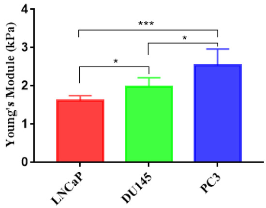 Apparent Young’s modulus of prostate cancer cells were measured using atomic force microscopy (AFM). LNCaP (1.613 ± 0.06403, n = 20), DU145 (1.984 ± 0.112, n = 25), PC3 (2.538 ± 0.2072, n = 25). (* indicates a p value of less than 0.05, *** indicates a p value of less than 0.001).