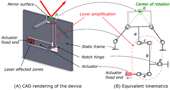 (A) Computer-aided design (CAD) drawing of a proof-of-concept of laser-tunable gimbal mirror. (B) Schematic of the mirror kinematics. The strain inside the actuator is coupled through a thin beam (a) to the lever arm (b). A second thin beam at the top (c) ultimately pulls on the mirror through (e) to cause a rotation. The lever mechanism is implemented through a circular notch hinge (d) fabricated by the same process. As the actuator is exposed, there is a net displacement towards the left and a subsequent rotation of the mirror. A deformed state of the mirror is shown in light gray.