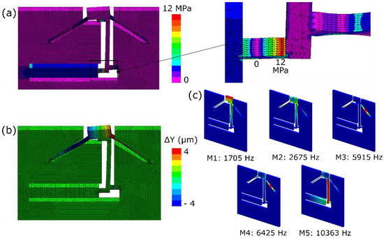 Results of the prescribed displacement analysis simulation corresponding to a 0.5 μm displacement applied to the actuator showing the (a) corresponding stress plot with a maximum stress level equal to 12 MPa and (b) total displacement along the y-axis (the figures are in the x-y plane with the z axis pointing outwards and y axis pointing upwards). (c) Natural vibrating modes of the device (Note that the vibration-induced displacements are exaggerated for visualization purposes).
