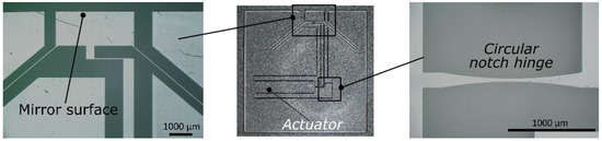 The fabricated device is shown here (middle). A digital microscope image of the mirror edge (left) and the notch hinge (right) are also shown.