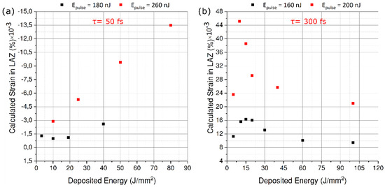 Strain in the laser-affected zones as a function of deposited energy for (a) τ = 50 fs and (b) τ = 300 fs and for two different pulse energies. One should note the switch from regime I (a) to regime II (b) with the increase of the pulse duration.