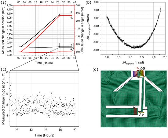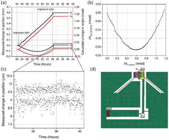 (a) Position measurement of the laser probe-beam spot on the detector surface. The measured change in position is plotted in black, while the corresponding angle change is plotted in red. (b) Out-of-plane bending angle vs the in-plane angle of rotation. (c) A magnified view of one of the position coordinates (y) after the exposure is stopped to show case the stability of the mirror in its deformed state. The observed noise is within the error of the detector. (d) The exposure configuration.