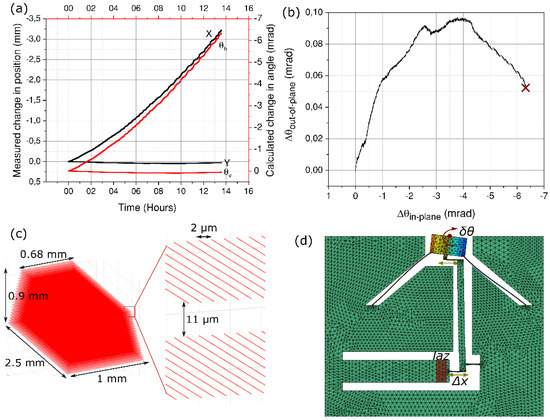 As can be seen from Figure 8a, and as expected, the mirror movement is reversed as compared to earlier experiments with τ = 50 fs, thus confirming an overall volume expansion (positive strain) inside the actuator. In addition, we see a vertical offset of nearly 53 μ-radians between the initial and final out-of-plane angle (Figure 8b). This is due to a large in-plane deflection angle causing the beam to travel beyond the active area of the detector (marked by a cross). As discussed in the previous section, any parasitic offset can be corrected for by modifying the writing strategy and writing more lines near the top surface, as in this case, or writing fewer, as in the earlier cases. In general, out-of-plane bending can be nearly completely suppressed by writing close to the neutral line of the actuator rather than exposing the whole bulk from bottom to top.