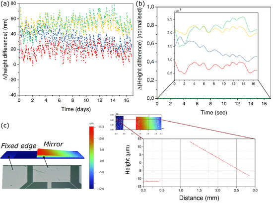 To understand this, we load our device with the same parameters as used in last experiments (Section 3.4). After exposure, the deflection is measured under a white light interferometer as shown in Figure 9c. For the stability test, we use a digital holographic microscope (Lyncée Tec, Lausanne Switzerland) in a reflection mode that illuminates both the mirror and the static glass frame at the same time while holograms are recorded. Based on the recorded pattern, the change in height difference between any arbitrary point on the mirror surface and a fixed point on the base is monitored for 16 days. In Figure 9a, the data for four such points is plotted.