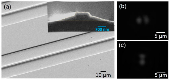 Spatial modes were excited and characterized by coupling the waveguide with a 1550 nm wavelength laser using a fiber lens. The polarization state of the input light was controlled by an in-line polarization controller. The light transmitted from the output port of the waveguide was collected by an objective lens with NA = 0.3. A beam expander was introduced behind the objective lens, and it projected the image of the output port onto an infrared charge-coupled device (CCD) (InGaAs camera, HAMAMATSU Inc., Shizuoka, Japan). The spatial distributions of transverse-electric (TE) and transverse-magnetic (TM) modes were captured by the CCD, as shown in Figure 2b,c, respectively. The waveguide supported high-order spatial modes for the TE and TM modes owing to the high refractive index of LN and the large transverse dimensions of the waveguide.