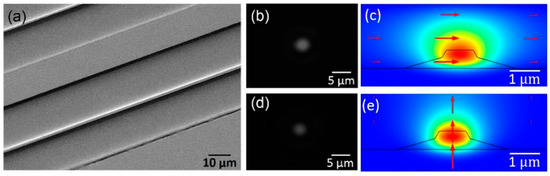 To produce single-mode LNOI waveguides for both the TE and the TM mode, Ta2O5 (refractive index 2.057) of ultralow loss [22] was deposited onto the fabricated sample by electron-beam evaporation. Figure 3a shows the scanning electron microscope (SEM) image of the LN ridge waveguide covered with the Ta2O5 cladding layer of 3.5 µm thickness. A single-mode spatial profile was obtained for TE mode, as shown in Figure 3b, which was consistent with the calculated mode profile in Figure 3c. Similarly, such a waveguide supported single-mode propagation for TM mode as well, as shown in Figure 3d and evidenced by the corresponding calculation result in Figure 3e. The full width at half maximum (FWHM) of the TE mode was measured to be ~2.5 µm, and the FWHM of the TM mode was ~2.3 µm.