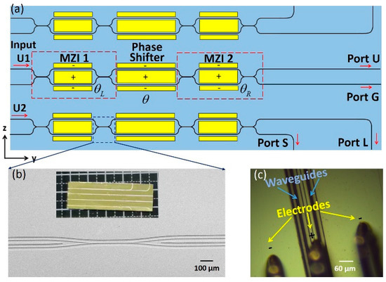 To measure the propagation loss of the single-mode waveguide, the laser was coupled to input Port U2 of the bottom beam splitter in Figure 4a, and both MZIs were tuned at a 50:50 splitting ratio via EO modulation. Then, power output from Port S was tuned to be maximal by adjusting the voltage applied on the phase shifter. Finally, power output from Port S was tuned to be half the maximal value. In other words, phase difference θ between the two arms of the phase shifter in the bottom beam splitter was π/2, and the powers injected into output Ports S and L were the same. Propagation loss was measured to be 0.042 ± 0.02 dB/cm by comparing the powers at output Ports S (averaged counts: 3943) and L (averaged counts: 3898). Median measured error was originated from the minimal tuning step of the voltage source.
