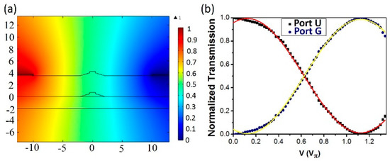 (a) Calculated normalized electric-field distribution in cross-sectional plane of LNOI waveguide when applying voltage on Au microelectrodes, showing that the electric field was almost parallel to the LN optic axis. (b) Normalized transmission spectra of output Ports U and G as a function of applied voltage V, featuring sinusoidal-like curve.