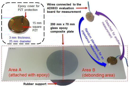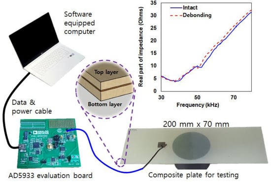In this study, experiments were conducted at a room temperature of 24 °C (±0.2 °C) using the AD5933 evaluation board manufactured from Analog Devices Co (Norwood, MA, USA). The equipment allows one to measure impedance up to 100 kHz with over 500 data points. Shown in Figure 1, the AD5933 evaluation board is connected to a computer and the test specimen made of two composite plates (glass fiber epoxy laminate) adhered together using a commercial epoxy adhesive (Loctite Quick Set). The two composite plates of size 300 mm × 100 mm with 0.6 mm thickness (with Poisson ratio 0.3, density of 1550 kg/m3, Young’s modulus 17 Gpa) were purchased from a domestic company (ArtRyx, Gyeonggi-do, Republic of Korea) and the piezoelectric patch model PSI5A4E was purchased from Piezo Systems (Woburn, MA, USA).