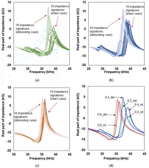 Observing in Figure 3d intact cases (0.2_int, 0.4_int, and 0.6_int), there is no frequency shift between 0.2_int and 0.4_int but a frequency shift in the left direction for 0.6_del can be seen. This experimentally proves for this study that the relationship between the thickness of the target structure and the frequency shift movement does not have a simple linear relationship, increasing the complexity when analyzing data. Next, observing at the debonding cases (0.2_del, 0.4_del, and 0.6_del), that the difference between 0.2_del and 0.4_del is small with the 0.4_del impedance peak having the highest value among the three impedance signatures (three dotted lines). This result is interesting when compared to the three intact cases as this shows that the increase in thickness does not always result in higher amplitudes. The higher amplitude for 0.4_del compared to 0.6_del shows that the 0.4 mm thickness may create larger resonances in the 25–45 kHz frequency range using the PZT-metal transducer created for this study. Another possibility of this outcome is that since the impedance signatures were measured 10 times by randomly placing the PZT-metal onto the composite structure, it is possible that this randomness has affected the outcome. Nevertheless, such phenomenon should be further researched in detail in the near future.