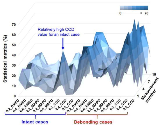 To simply summarize the guideline for identifying the possibility of debonding depth of the glass epoxy composite plates used for this study, the conditions are as follows. Averaged RMSD and CCD values both resulting in between 30% and 40% means debonding has occurred at 0.2 mm depth. Averaged RMSD value of over 30% and CCD value of over 50% is that debonding exists at 0.4 mm depth. Lastly, averaged RMSD and CCD values between 10% and 20% states that debonding has occurred at 0.6 mm depth.
