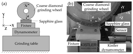 After the diamond grinding wheel was dressed, the axial-feed grinding experiments of sapphire glass were carried out on the three-axis grinding machine (SMART-B818III, CHEVALIER, Taiwan). In the grinding experiments, the synthetic sapphire glass was chosen as a workpiece and its composition was mainly alumina (Al2O3). The sapphire glass was first bonded to the polymethyl methacrylate (PMMA) plate, and then the plate was fixed on the dynamometer through a fixture. The dressed coarse diamond grinding wheel carried out axial forward reciprocating motion on the surface of sapphire glass. The schematic diagram of axis-grinding is shown in Figure 2a and the grinding photo is shown in Figure 2b. The workpiece size was 30 mm × 15 mm × 0.5 mm. The physical properties are shown in Table 1. The grinding area was 20 mm × 6 mm.