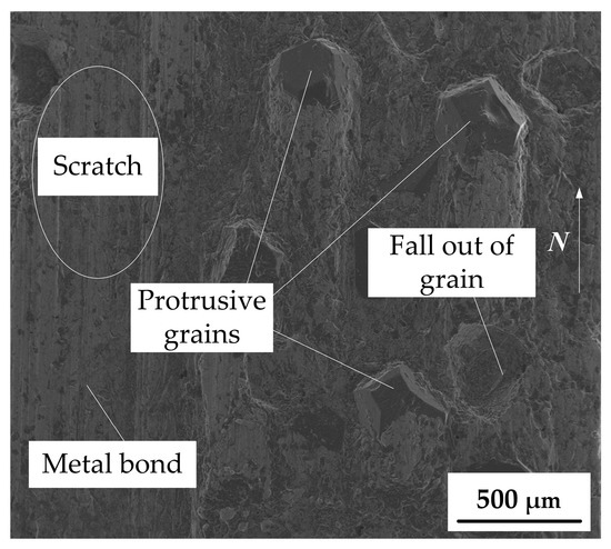 The grain protrusion characteristics of the diamond wheel surface directly affect the grinding quality and processing efficiency of the sapphire glass surface. After the grinding wheel was dressed by dry electrical discharge, the grain protrusion topography of the grinding wheel surface is shown in Figure 3. It can be seen that most of the diamond grains have protruded from the metal bond surface to form sharp micro-grain cutting edges. Meanwhile, it can be seen that there was a discharge crater due to the diamond grain falling out, which was mainly caused by excessive electrical discharge dressing, indicating that the electric spark discharge occurred on the surface of the grinding wheel. Besides, some scratches were found on the surface of the grinding wheel. The possible reason was that there was an extrusion process between the diamond grinding wheel surface and the abrasive grains derived from the mixed electrode. It also further verified the principle of electrical contact discharge dressing shown in Figure 1c.