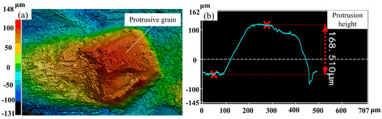 As seen from Figure 3, the distribution of diamond grains was random. Although some grains had fallen out, the overall cutting performance of the grinding wheel was not affected in macroscopic view. After the diamond wheel was dressed, the grain protrusion height of the grinding wheel surface needed to be detected. Figure 4 shows the 3D topography and protrusion height profile of a single diamond grain after the coarse diamond grinding wheel was dressed. Figure 4a shows the 3D topography of the single diamond grain protrusion. It is shown that the protrusion height of diamond grain was about 168.5 μm through measured profile curve of grain protrusion (see Figure 4b). Since the average size of #46 diamond grain was about 350 μm, the grain protrusion height can reach 48% of the theoretical grain size after electrical discharge dressing. According to the literature [20], after the traditional mechanical dressing, the grain protrusion height was only about 1/3 of the theoretical grain size. Therefore, compared with the traditional mechanical dressing, the dry electrical discharge dressing technique not only had higher dressing efficiency, but also could achieve a higher grain protrusion, which was conducive to continuous and efficient grinding. Large grain protrusion height can produce large chip space, which can reduce the accumulation of chips in the grinding area, leading to reductions in friction and grinding force and an improvement in ground surface quality.