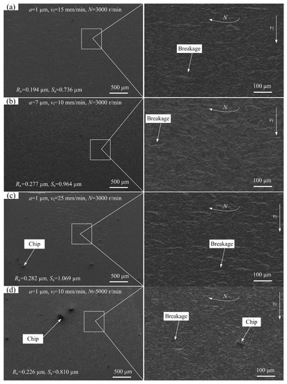 In order to study the effects of different grinding process parameters on surface quality of ground sapphire glass, the microscopic topographies of axial-ground surface were observed and analyzed. Figure 7 shows the SEM photos of ground sapphire glass surface under different grinding process parameters. Comparing Figure 7a,b, when the depth of cut increased and feed speed decreased, the surface roughness Sa and line roughness Ra of ground sapphire glass increased, leading to degradation in overall quality of the ground surface. Moreover, too much cutting removal would cause some breakages on the ground surface. Comparing Figure 7a,c, it can be seen that the roughness values Sa and Ra of ground sapphire glass greatly increased with the increase of feed speed, indicating that the feed speed had a greater influence on the ground surface quality than the depth of cut. According to the basic grinding principle of hard and brittle materials [21], increasing the wheel speed will increase the number of diamond grains involved in grinding per unit time so that the cutting amount of a single grain will decrease, resulting in reduction of both grinding force and surface roughness. Comparing Figure 7a,d, it is found that when the wheel speed increased and feed speed decreased, the surface quality of ground sapphire glass declined, demonstrating that the feed speed had a greater influence on the ground surface quality than the wheel speed. Therefore, it is necessary to choose appropriate feed speed in precision grinding of sapphire glass.