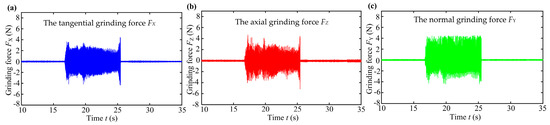 Testing curve of grinding force F on sapphire glass surface: (a) tangential grinding force FX; (b) axial grinding force FZ and (c) normal grinding force FY.