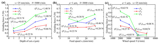 The grinding force F of sapphire glass surface versus grinding process parameters: (a) depth of cut a; (b) feed speed vf and (c) wheel speed N.