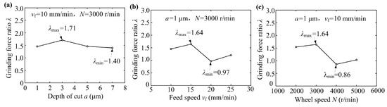 The grinding force ratio λ versus grinding process parameters: (a) depth of cut a; (b) feed speed vf and (c) wheel speed N.