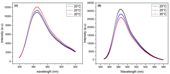 Fluorescence spectra of Rhodamine 6G (A) and Rhodamine B (B) versus temperature.