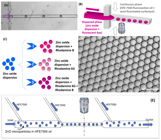 (A) Optical micrograph and schematic illustration of (B) the flow-focusing microfluidic geometry for zinc oxide droplet formation; (C) and the different case studies; (D) Optical micrograph of stable and monodisperse zinc oxide droplets generated through the flow-focusing microfluidic device, Scale bar, 100 μm; (E) Schematic illustration of the used microfluidic design for fluorescence analysis of doped ZnO microparticles.