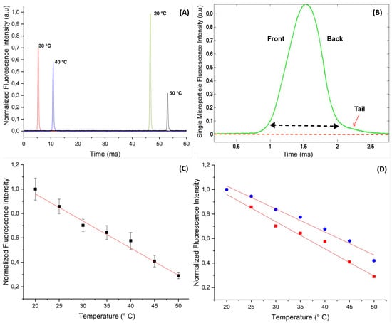We first show in Figure 4A the fluorescence intensity peaks of individual flowing microparticles as they were detected and recorded from different experiments (at different temperatures). Because microparticles were randomly dispersed in the carrier oil, the time at which microparticles crossed the constriction area of the microfluidic channel, where they were detected, was random and hence the origin of the time axis was arbitrary. Nevertheless, one could have the measured value of the width of each peak to roughly estimate the size of the microspheres, which was found here to be about 1.5 ms, as shown in Figure 4B.