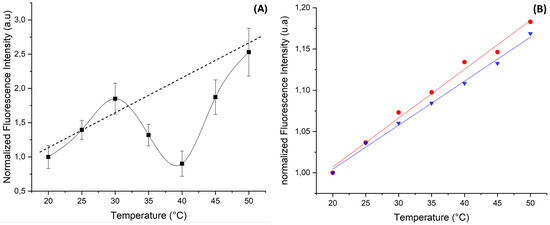 Figure 5A shows the change versus temperature of the fluorescence intensity of ZnO microparticles when doped with Rh6G dye. As may be noticed, though the fluorescence intensity appeared to increase globally with temperature, as observed in the bulk solution [6], we observed for the first time that the fluorescence intensity exhibited a minimum around 40 °C. This behavior is reproducible and was observed only when ZnO microparticles were doped with Rh6G.