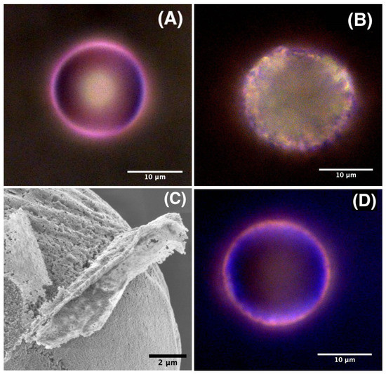 Figure 6A shows that RhB molecules organized in a homogeneously distributed pink colored shell around ZnO microsphere, which corresponded basically, as stated earlier, to a microcapsule with a thin porous envelope having a thickness of about 0.7 μm, as shown in more detail in reference [27]. We emphasize in this study the porosity of the microcapsule shell, which resulted from the aggregation of ZnO nanoparticles building units, whose average size was found to be about 100 nm, and the formation of voids between such nanoparticles, as can be seen from the scanning electron microscope (SEM) image shown on Figure 6C. One may suggest also that these pores may serve as niches for aggregates of dyes molecules.