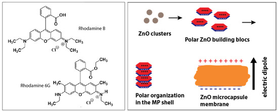 We suggest that the two different behaviors of the two dyes with ZnO microcapsules should be related to the electrical charges carried by the dyes and the electrically charged ZnO nanocrystals building blocks. Indeed, whereas RhB molecules can adopt (depending on the pH value) either a positively charged form or a zwitterionic form, for which the overall electrical charge is zero, Rh6G molecules can carry only a positive electric charge, as shown from their chemical structures in Figure 7A. Also, ZnO nanocrystals are known to carry a net electric dipole moment, which is inherent to the tetrahedral configuration of the wurtzite crystalline structure. In a such structure, each type of ion, Zn or O, has four neighbouring ions of the other type of atom, and vice versa. That is to say, the tetrahedral coordination exhibits a sequence of positively charged Zn and negatively charged O polar planes within the c-axis direction, thus respectively contributing to two opposite faces of polarity (0001) and perpendicular to the c-axis. This results in an intrinsic electric dipole moment and a spontaneous polarization along the c-axis of the nanocrystals [34,35,36,37,38].