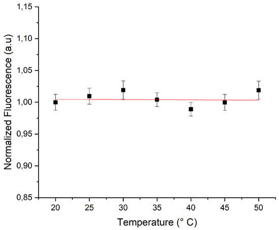 For each temperature, we collected the fluorescence signal from approximately 20 highly monodisperse microparticles and plot the average values with their standard deviation versus temperature, as shown in Figure 4C. This figure shows clearly that the fluorescence intensity of RhB doped ZnO microparticles decreased linearly vs. temperature with a rate of about /°C. The determined slope was in very good agreement with the value reported generally in the literature for RhB dye [4,5,6,12,13,14].