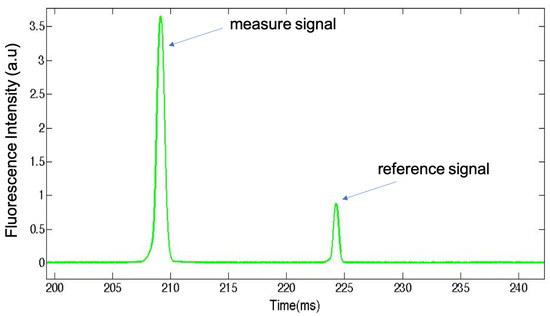 Different microparticles doped with two different dyes may be discriminated by the value of their fluorescence intensity signals. Such concentration based coding method will be applied in the future for the simultaneous recording of the fluorescence intensity signals from RhB doped microparticles (measure probes) and Rh110 doped microparticles (reference probes).