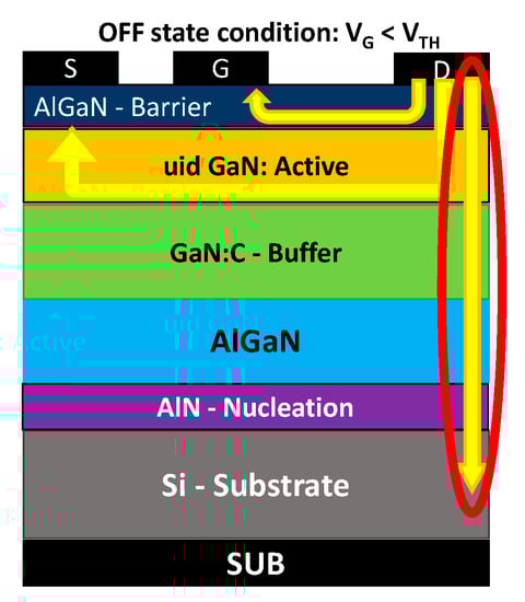 Gallium nitride (GaN) high-electron-mobility transistors (HEMTs) on silicon (Si) substrate are excellent devices for power applications, and are expected to find wide application in switching power converters [], owing to the high breakdown field of GaN (3.3 MV/cm) [,]. To grow GaN on Si substrates, it is necessary to develop complex buffer and transition layer architectures; these allow to obtain a good crystalline quality, which in turn leads to an improved electrical performance of the devices. However, the vertical leakage current (Figure 1) in OFF-state conditions may limit the breakdown voltage of power GaN-HEMTs. Recently, different efforts have been developed in order to improve the vertical robustness of such devices [,,,].