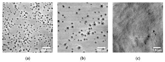 To investigate the material quality of the various layers, we used several experimental techniques. Using cross-sectioning and TEM-analysis, the TD-densities were estimated to be 3.2 × 1010 cm−2 for the AlN nucleation layers of all three structures, 2.3 × 1010 cm−2 for the Al70Ga30N layers of structures B and C, and 3.1 × 109 cm−2 for the GaN:C of structure C. Surface morphologies were analyzed by SEM and AFM. The results observed by SEM are shown in Figure 3. Structure A exhibits a strongly V-pitted surface due to non-optimized nucleation conditions []. The V-pit density was ~1.5 × 1010 cm−2 with a typical V-pit diameter of ~60 nm. A smaller V-pit density of ~5 × 109 cm−2, but with a larger typical V-pit diameter of ~120 nm was observed for structure B. Finally, no V-pits were observed for structure C, which was due to successful overgrowth by or below GaN:C. The corresponding rms-roughness values obtained on a scale of 5 × 5 µm2 by AFM are 2.35 nm, 7.55 nm, and 0.25 nm for structures A, B, and C respectively.