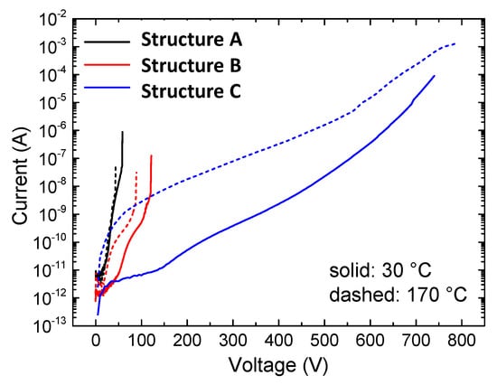 Blue lines in Figure 5 show the strong impact of temperature on the vertical leakage of structure C, which was compatible to the presence of a acceptor level like CN within GaN:C. Thus, for this sample, conduction was likely not only related to electrons as in structures A and B, but also to holes generated by the 0.9 eV deep acceptor CN. Holes in GaN:C can easily flow towards the bottom of this layer and, especially at high temperature, towards the Si substrate. Hole generation was stronger at high temperatures (consistent with [,]).